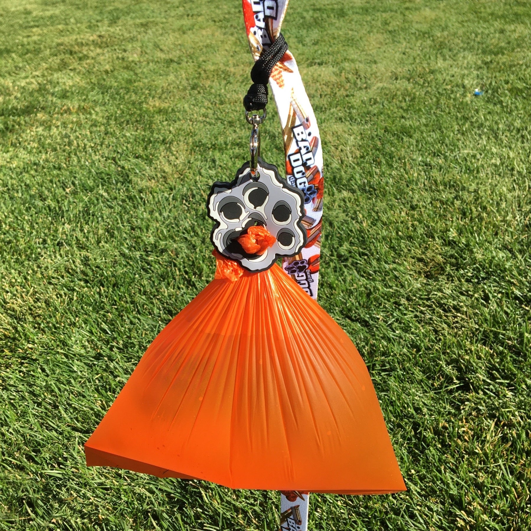Our poop bag holder is made of thick tough silicone and can more than one bag at time. We designed it after an AR Bolt Head. Those that know, know. It also comes with our new upgraded carabiner that will loop around a leash, harness, or whatever it will fit around. It also goes great with our Grenade Poop Bag Dispenser!